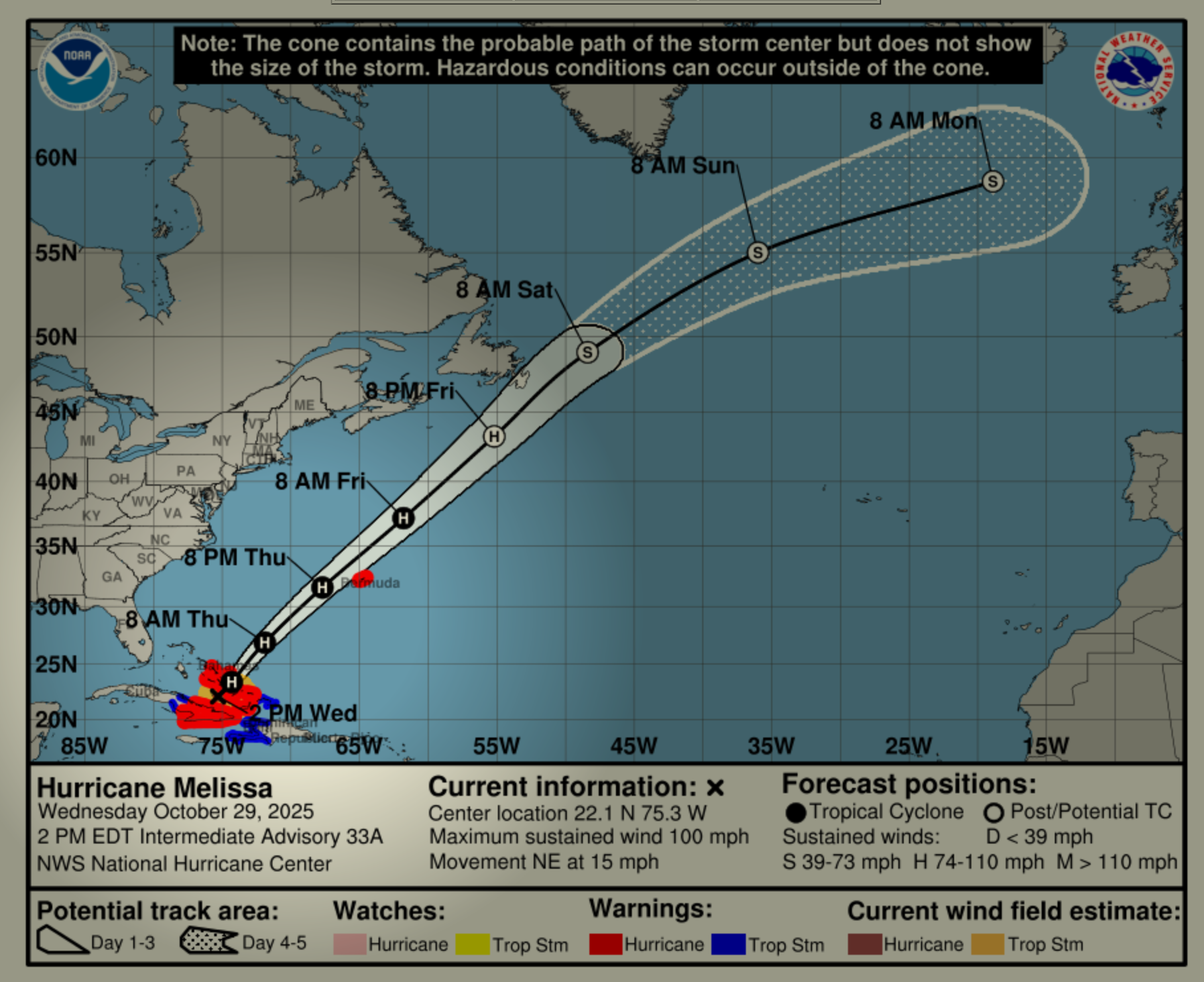 - Melissa’s path through the Caribbean. A day after Hurricane Melissa tore through Jamaica, it did the same through eastern Cuba, moving toward the Bahamas on Wednesday afternoon. As the storm’s eye left Cuban land, it weakened to a Category 2 hurricane with sustained winds of 160 kilometers an hour. Its forward motion picked up to 24 kilometers an hour, heading northeast. That will bring dangerous storm surges to the Bahamas, along with the Turks and Caicos, as soon as Wednesday evening. By late Thursday, Melissa should reach Bermuda, where the weather service has issued a hurricane warning. The storm will then head into the open Atlantic, where forecasters expect it to dissipate by Monday morning in the waters south of Iceland.