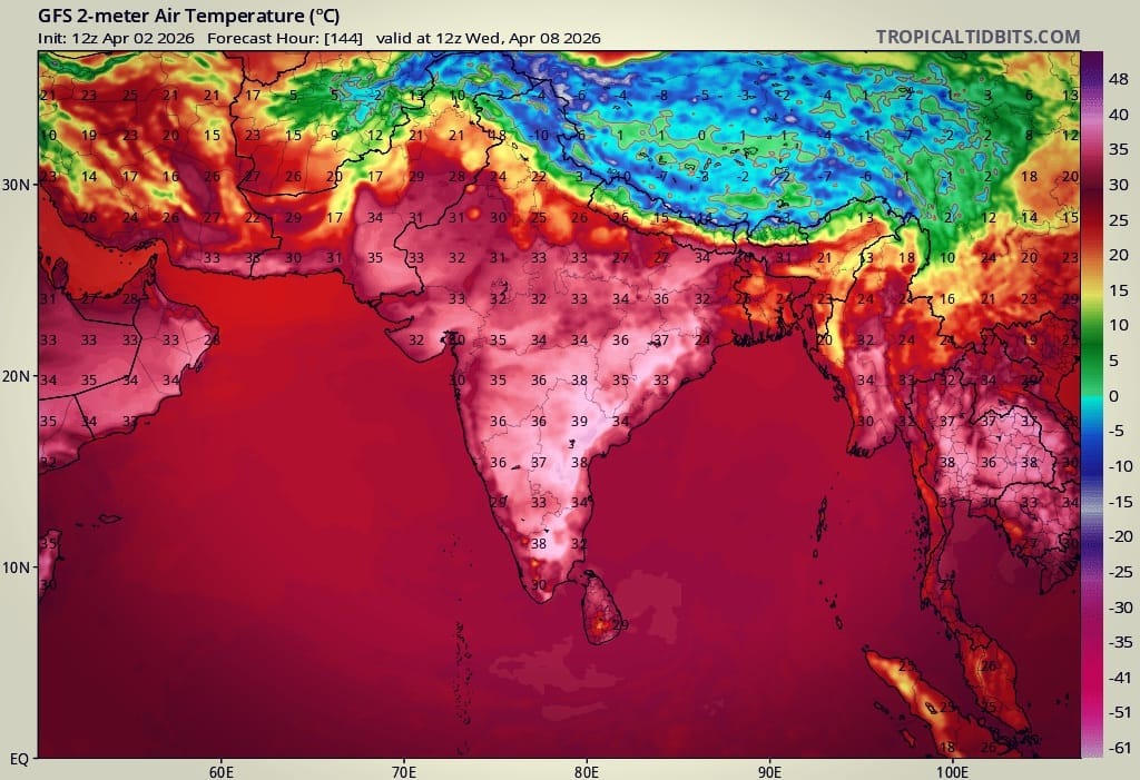 Heat from the south, cold air from the north—and a temperature gradient that will spark storms in the weeks ahead. That’s the picture across South and Central Asia next Wednesday afternoon, according to the U.S. Global Forecast System. Central Asia and Tibet are running several degrees below normal. India is not.